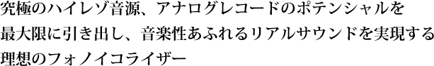 増幅素子に超ローノイズ、ハイゲイン、ワイドレンジという理想のアンプに近似した特性のオぺアンプを全面的に採用。また特に低出力、ローインピーダンスのMC出力を受ける初段のオペアンプには最新の超ローノイズ、ハイゲインのバイポーラ入力のオペアンプを、一方ハイインピーダンスなMM出力に対しては、超ハイスルーレートのFET入力のオペアンプを選択、それぞれのカートリッジの長所や潜在能力をフルに発揮させます。また出力段には600Ω負荷でも楽々と駆動可能なオーディオ専用のオペアンプを採用するなど、片チャンネル、オペアンプ4石のみという合理的かつシンプルな回路によって構成され、シンプルであるが故に高音質で自然でリアルな音質を実現しています。